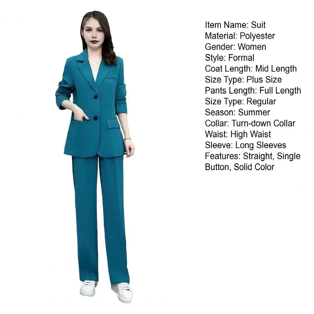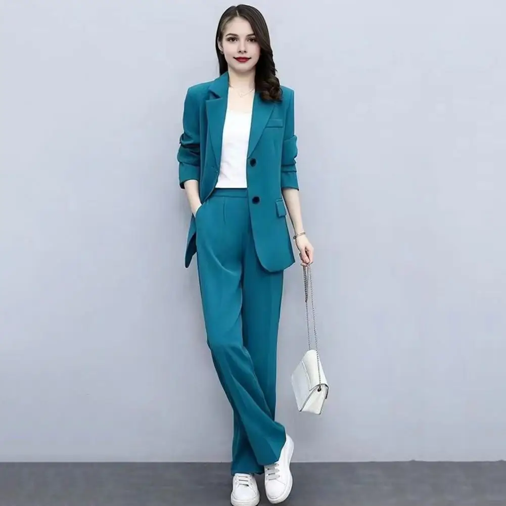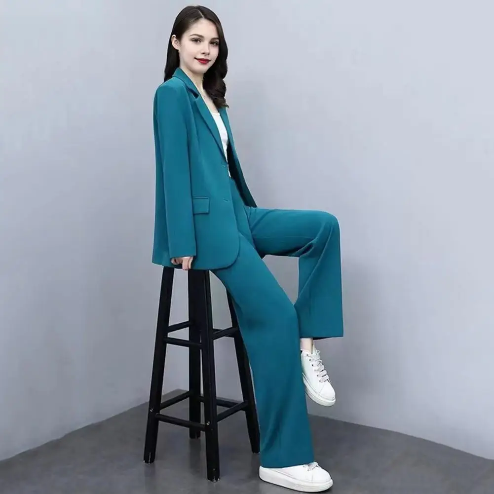 2 Pcs/Set Women Coat Pants Set Lapel Single Button Mid Length Cardigan Long Sleeve Jacket Wide Leg High Waist Straight Trousers Lady Formal Commute Outfit