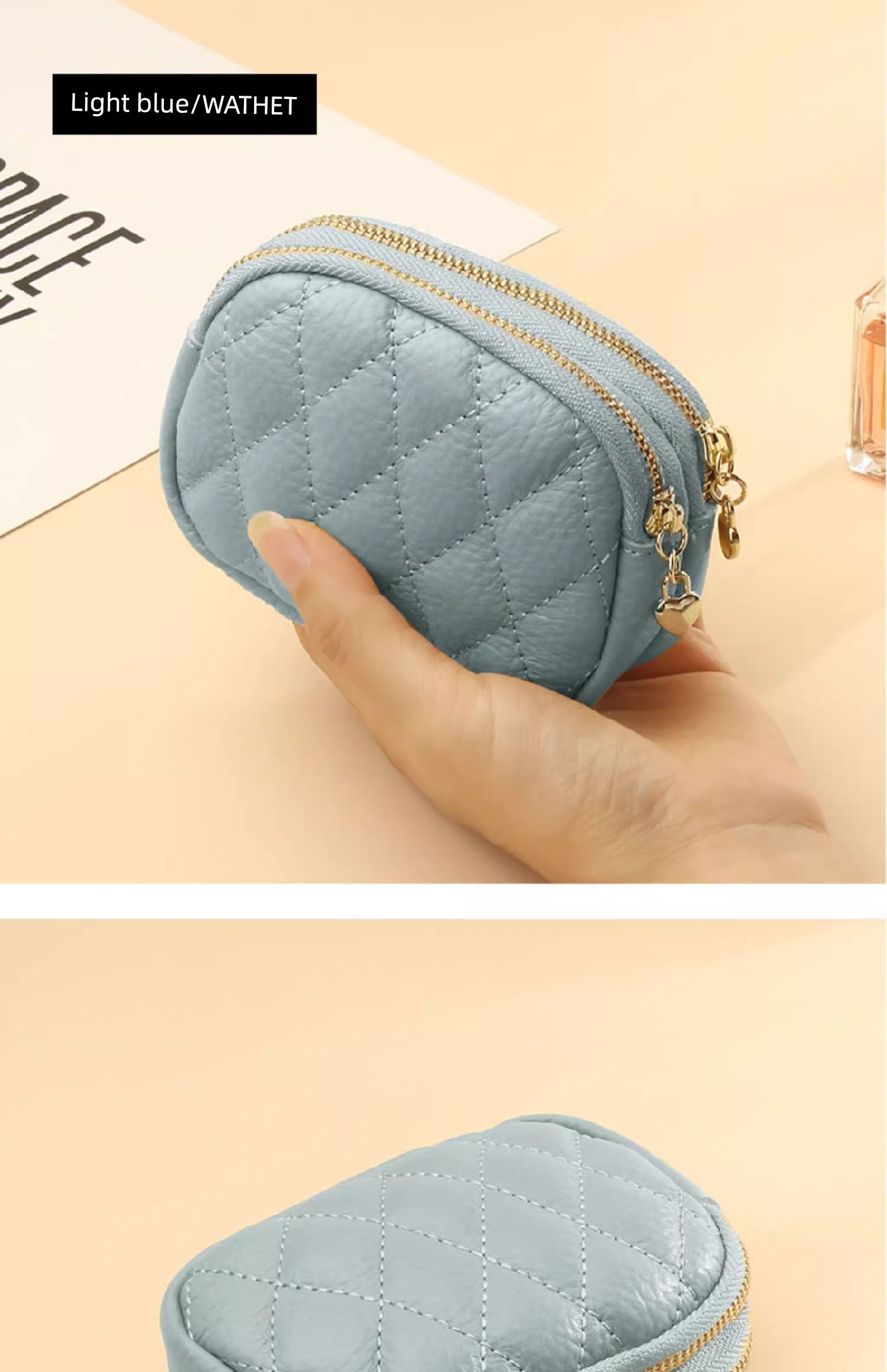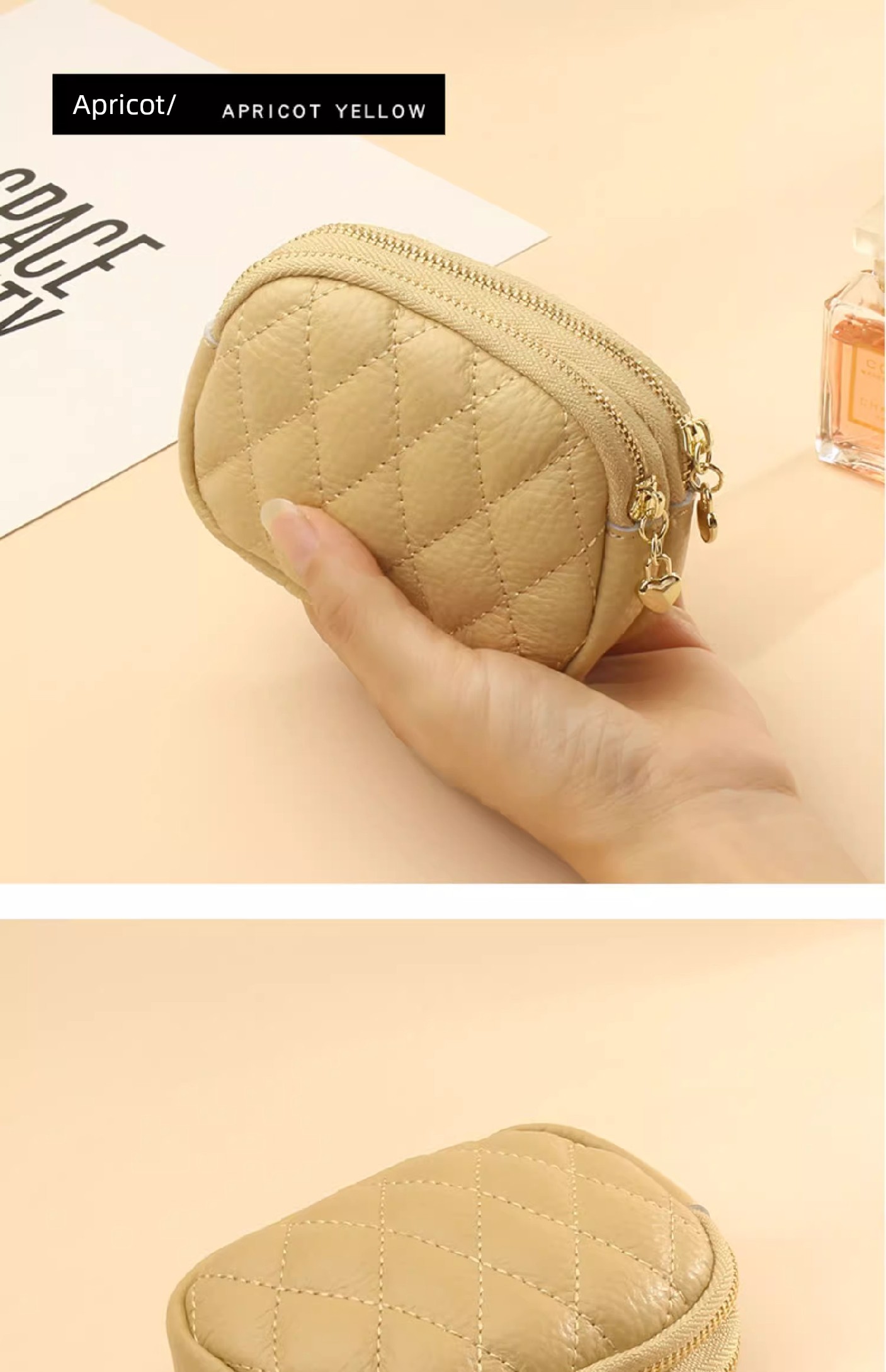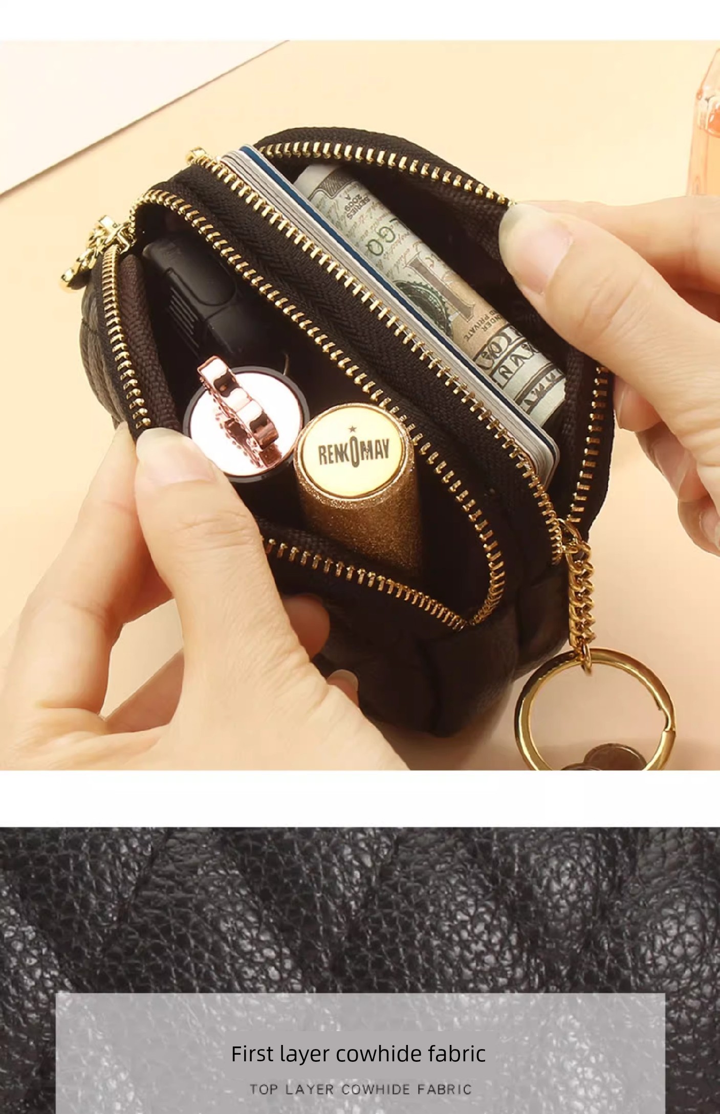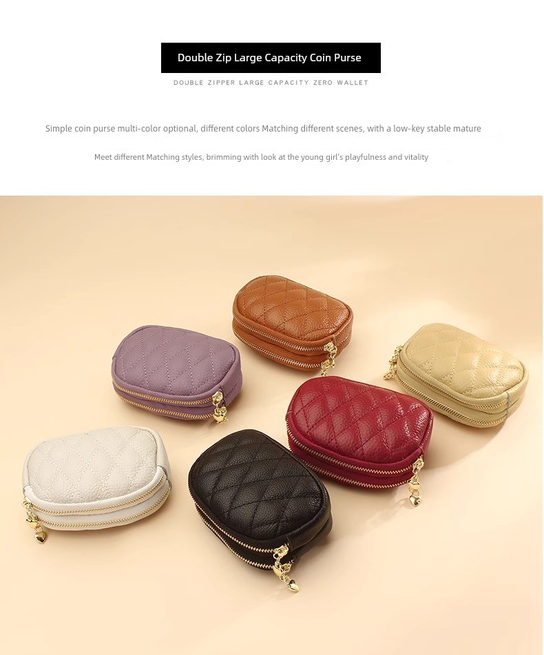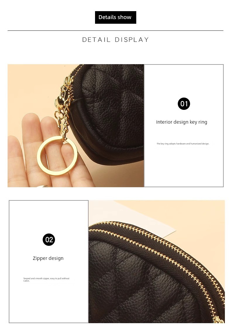 2024 New Arrival First Layer Cowhide Quilted Embroidery Thread Key Ring Buckle Coin Bag Double Layer Zipper Genuine Leather Mini Purse Women