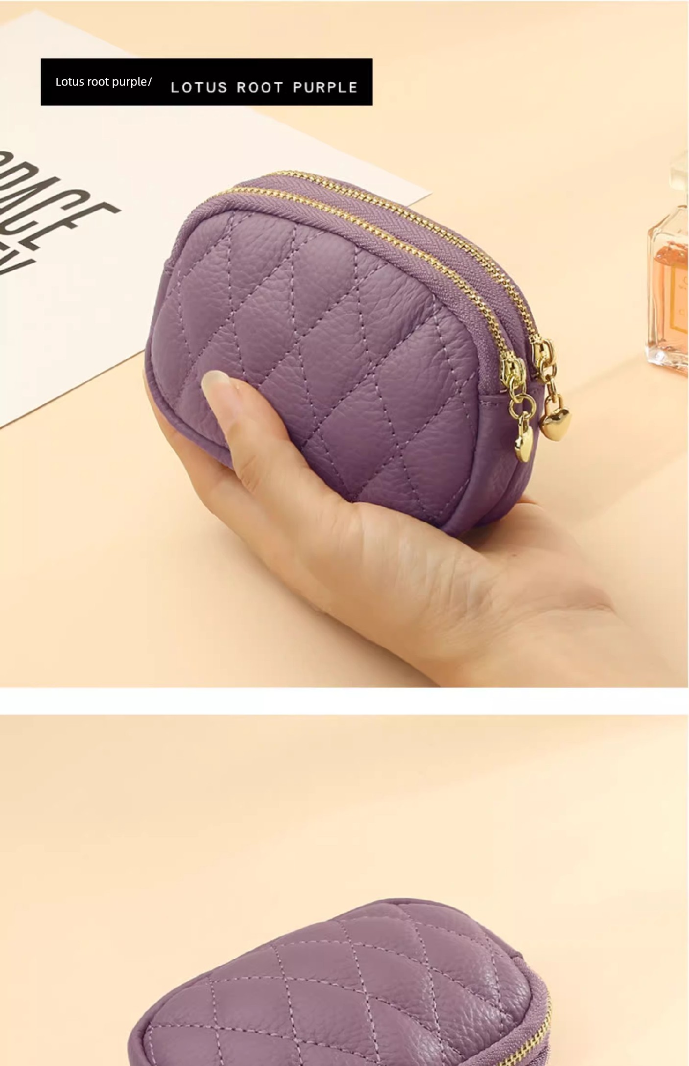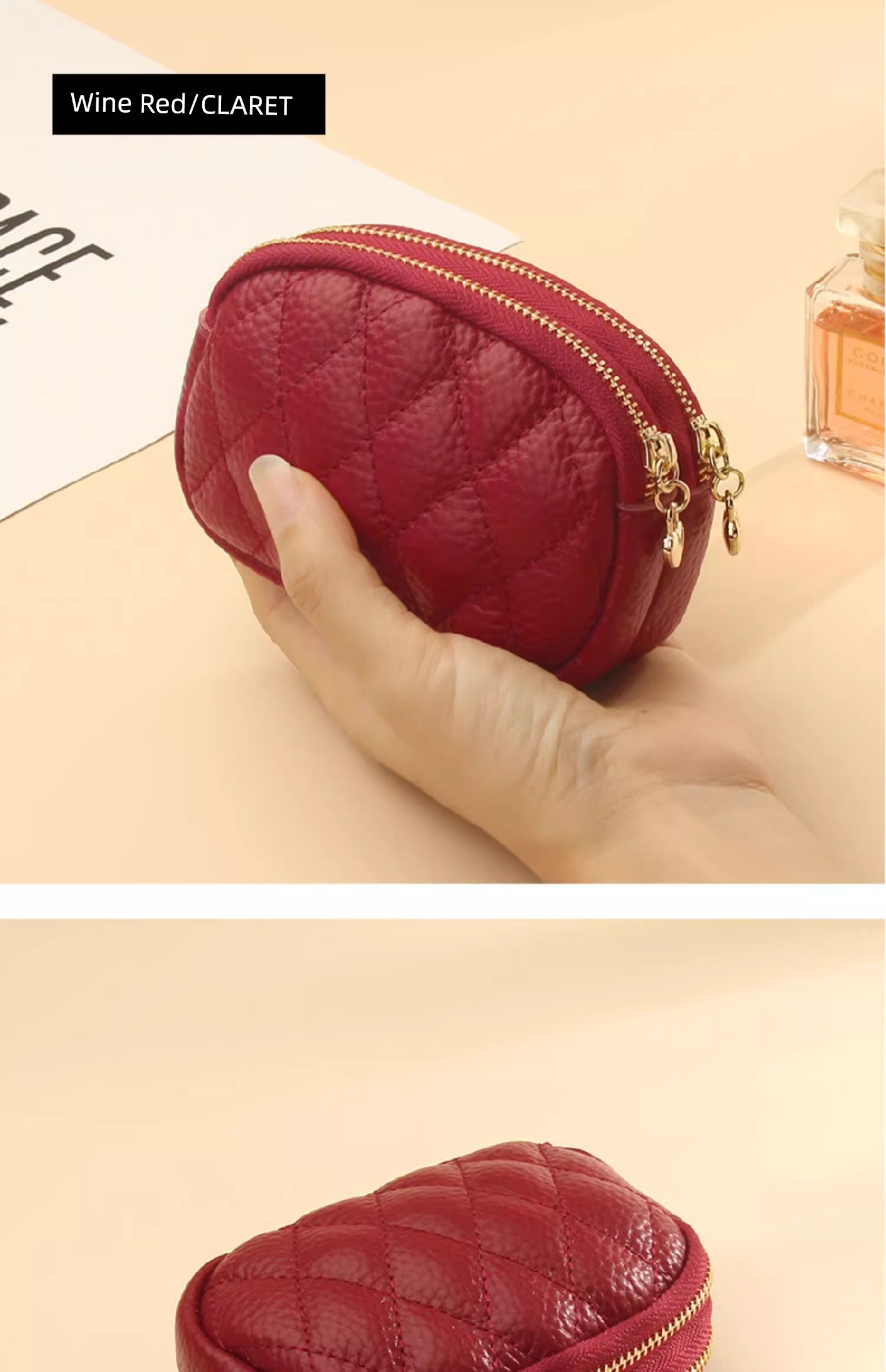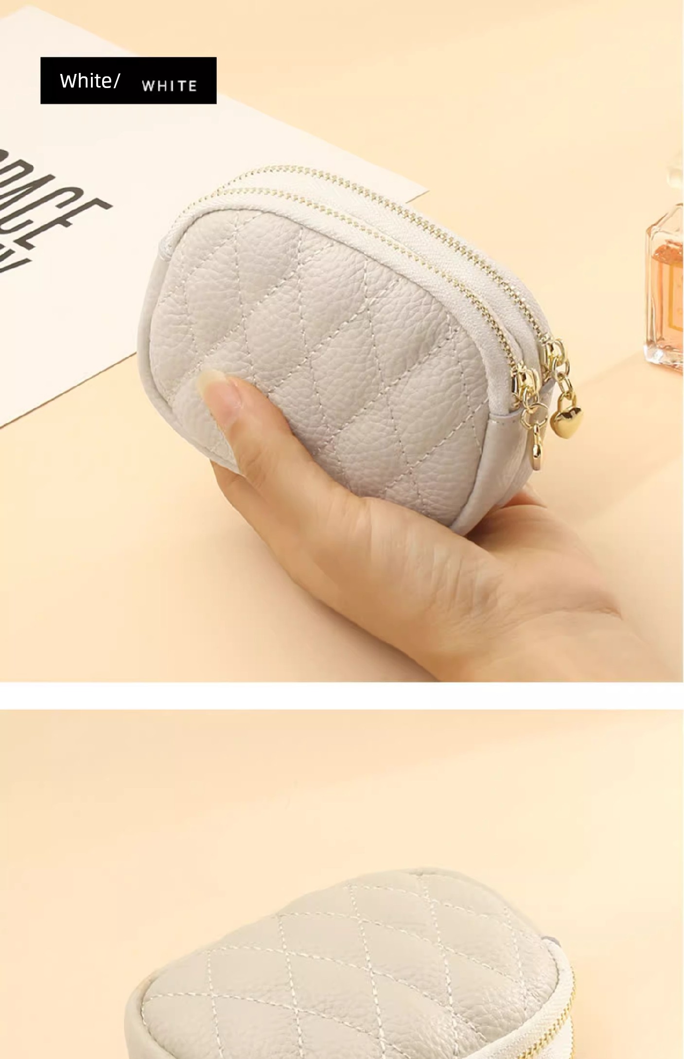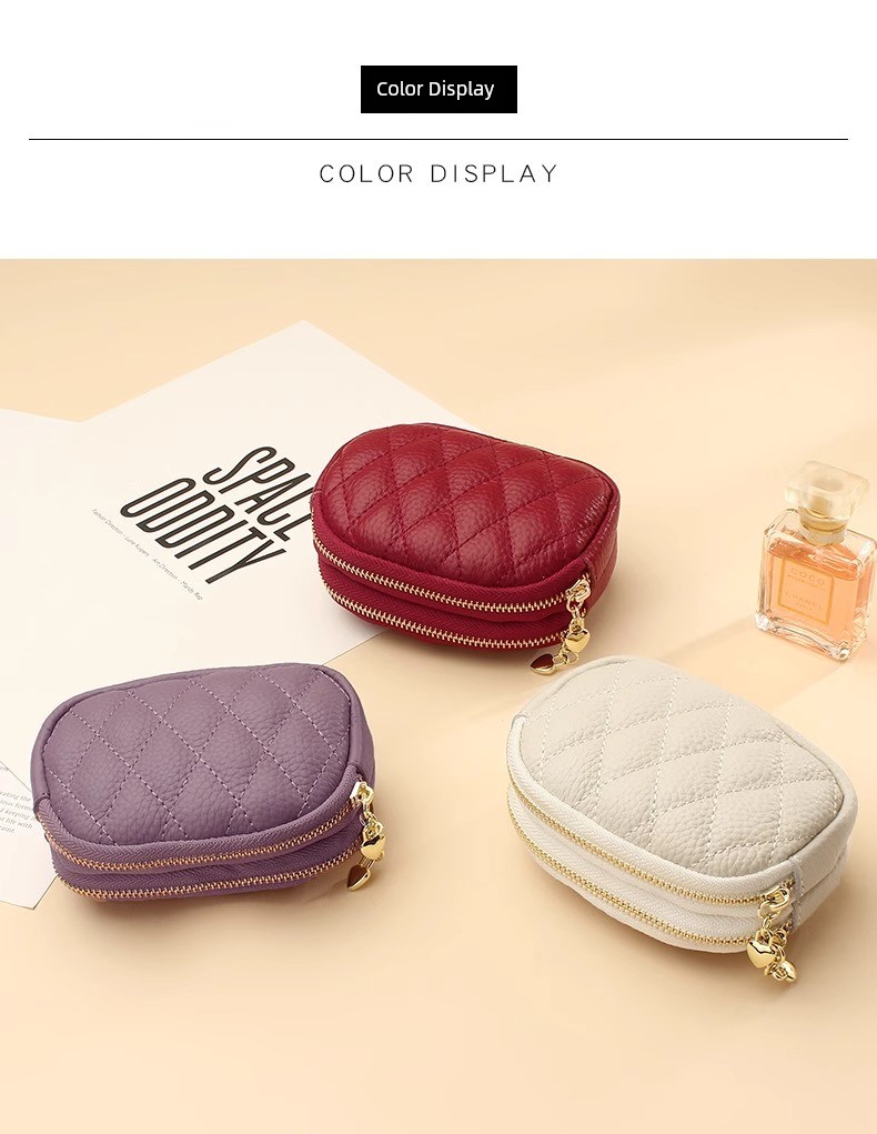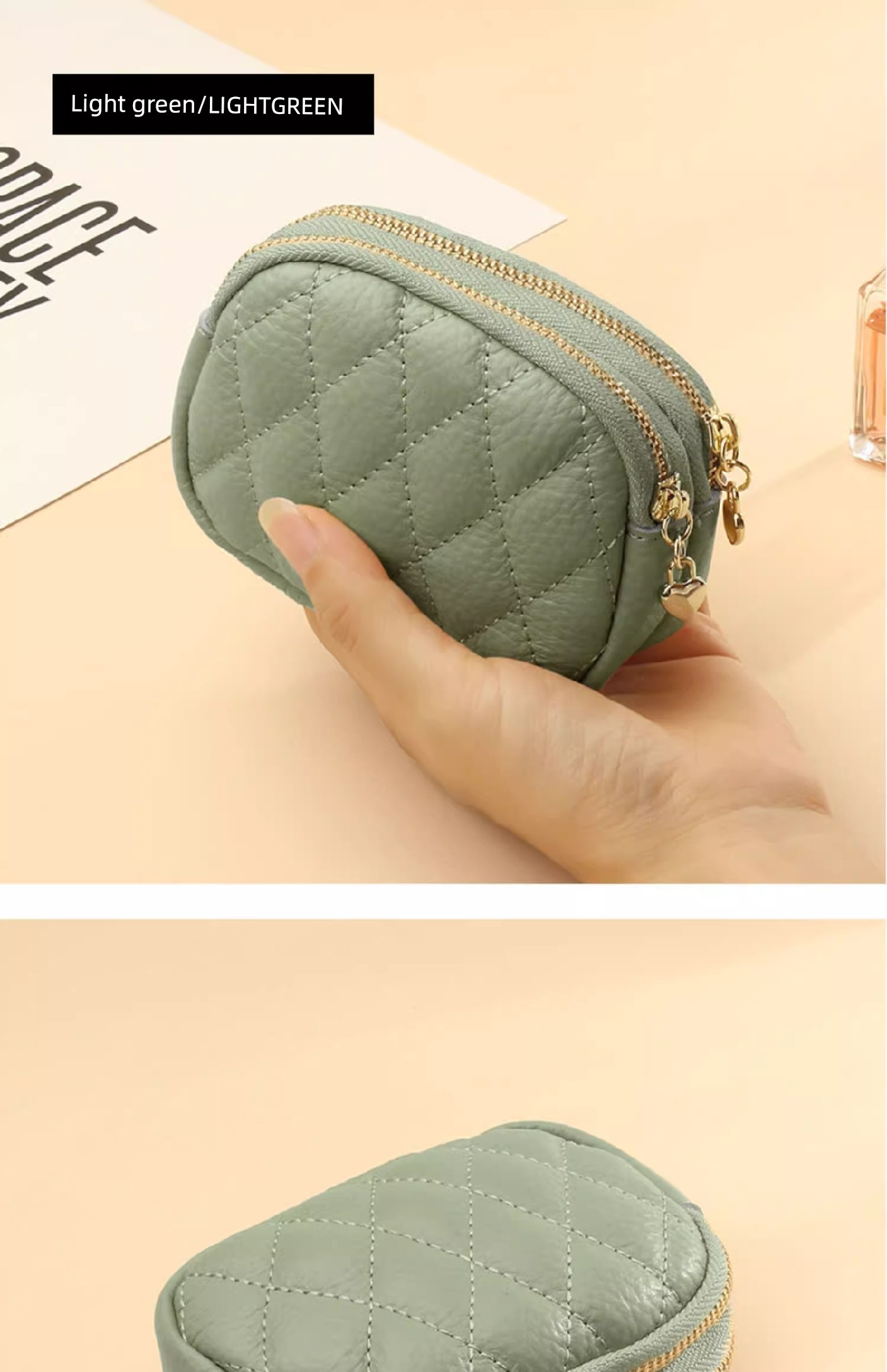 2024 New Arrival First Layer Cowhide Quilted Embroidery Thread Key Ring Buckle Coin Bag Double Layer Zipper Genuine Leather Mini Purse Women
