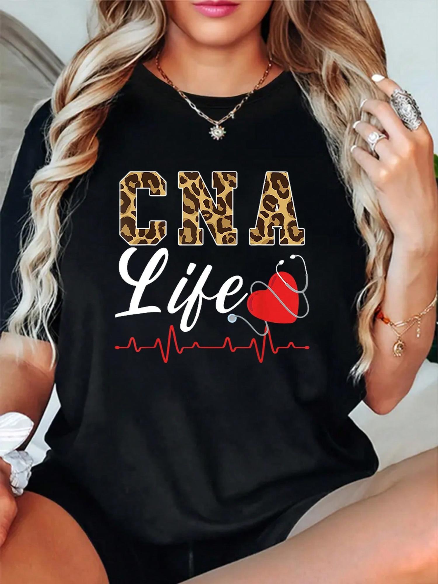 CNA Life Graphic Tee - Women’s Casual Round Neck Short Sleeve T-Shirt, Black with Leopard Print & Medical Heartbeat Design, Soft Fabric, Perfect for Summer, Ladies T Shirts