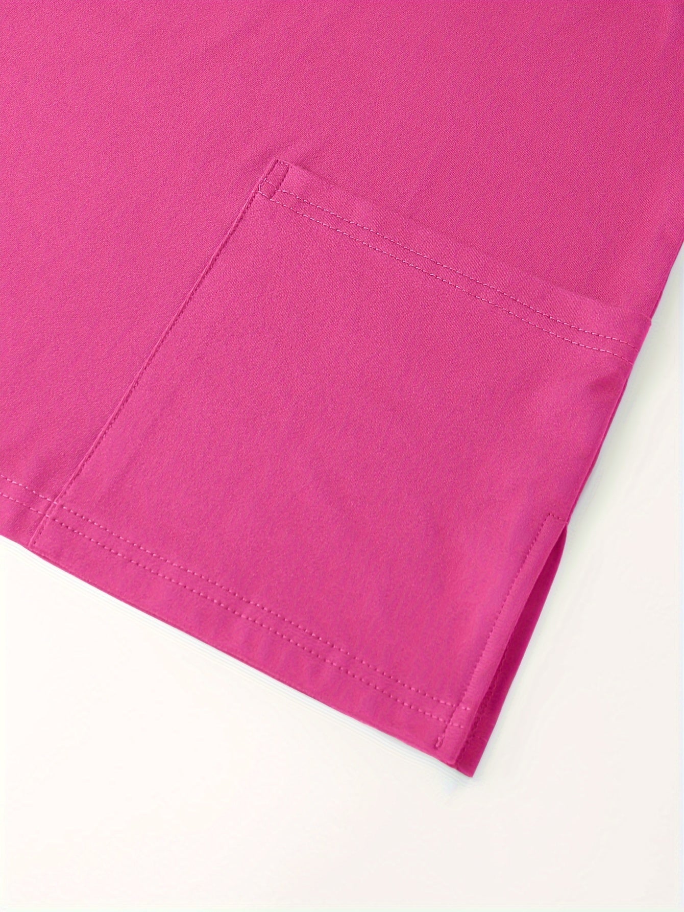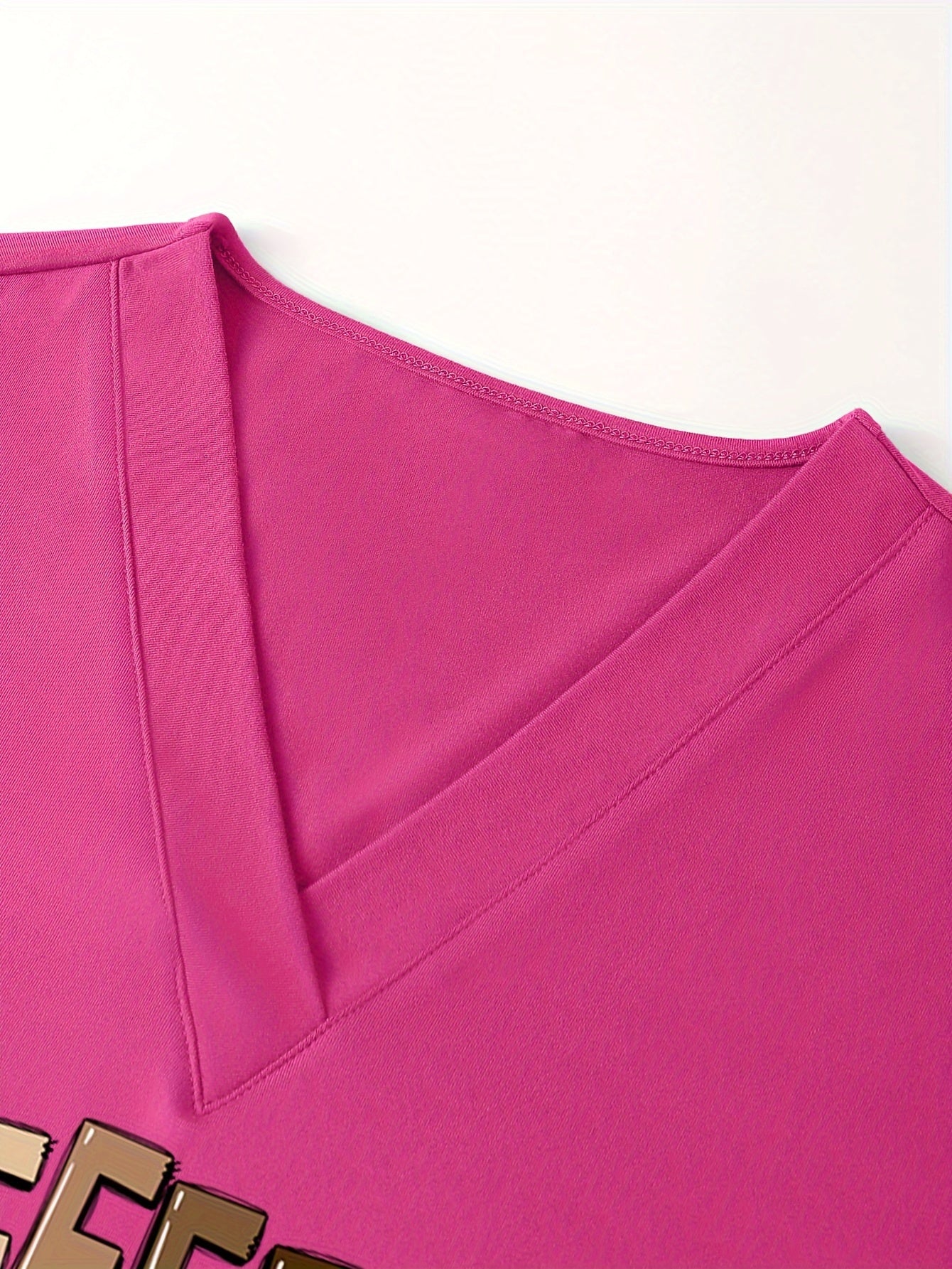 Coffee Letter Print V Neck Scrub Tops with Split, Elegant Patched Pockets Short Sleeve Nurse Uniform, Women's Clothing