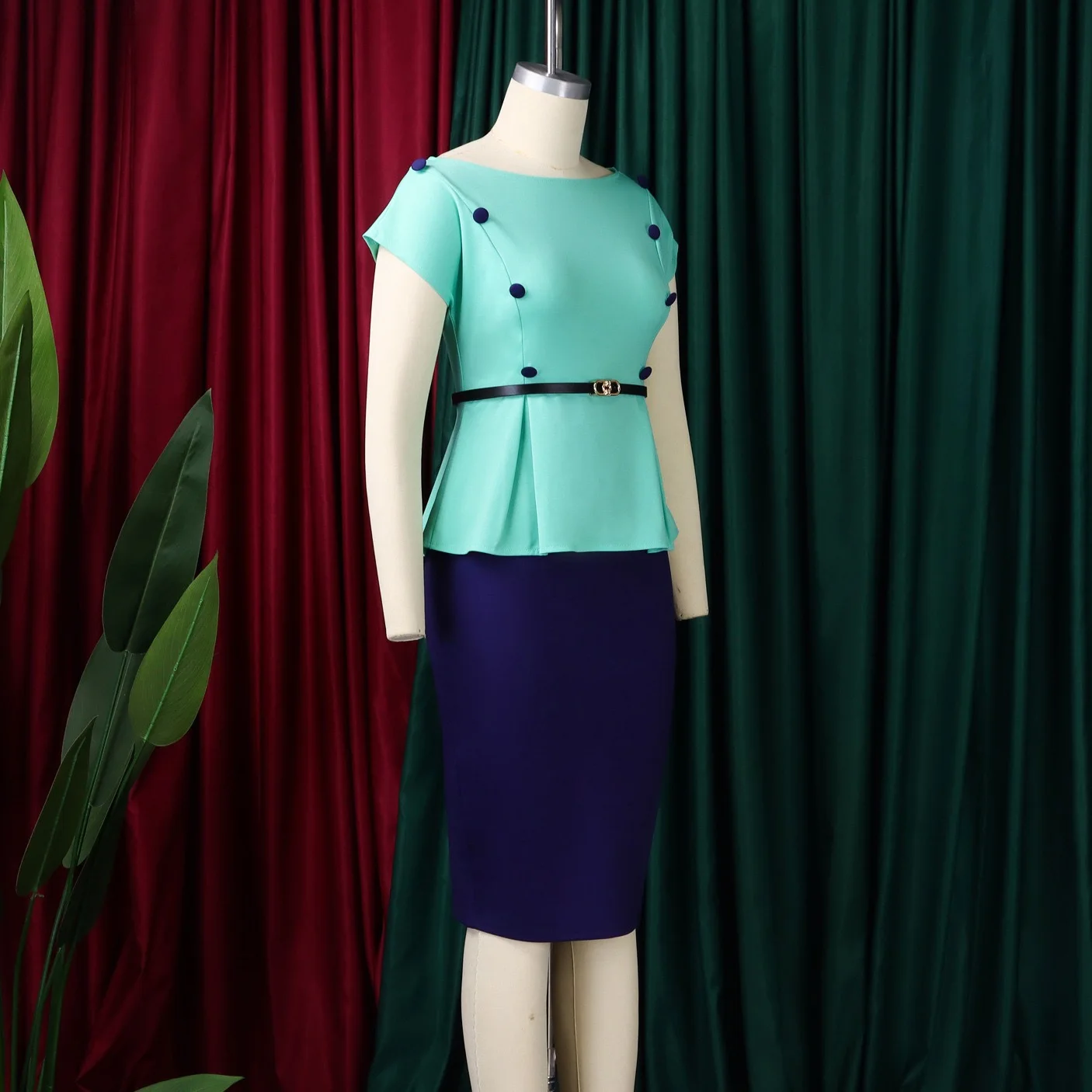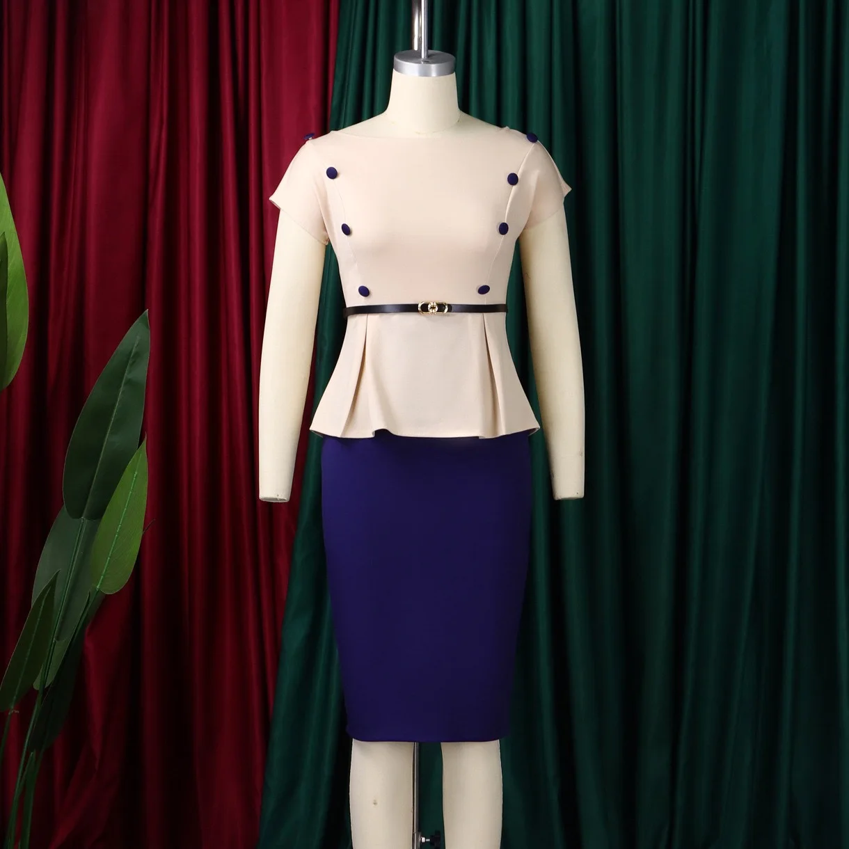 Elegant Office Dresses for Women O Neck Short Sleeve Belt Waisted Package Hips Mid Calf Professional Business Work Dress Midi OL