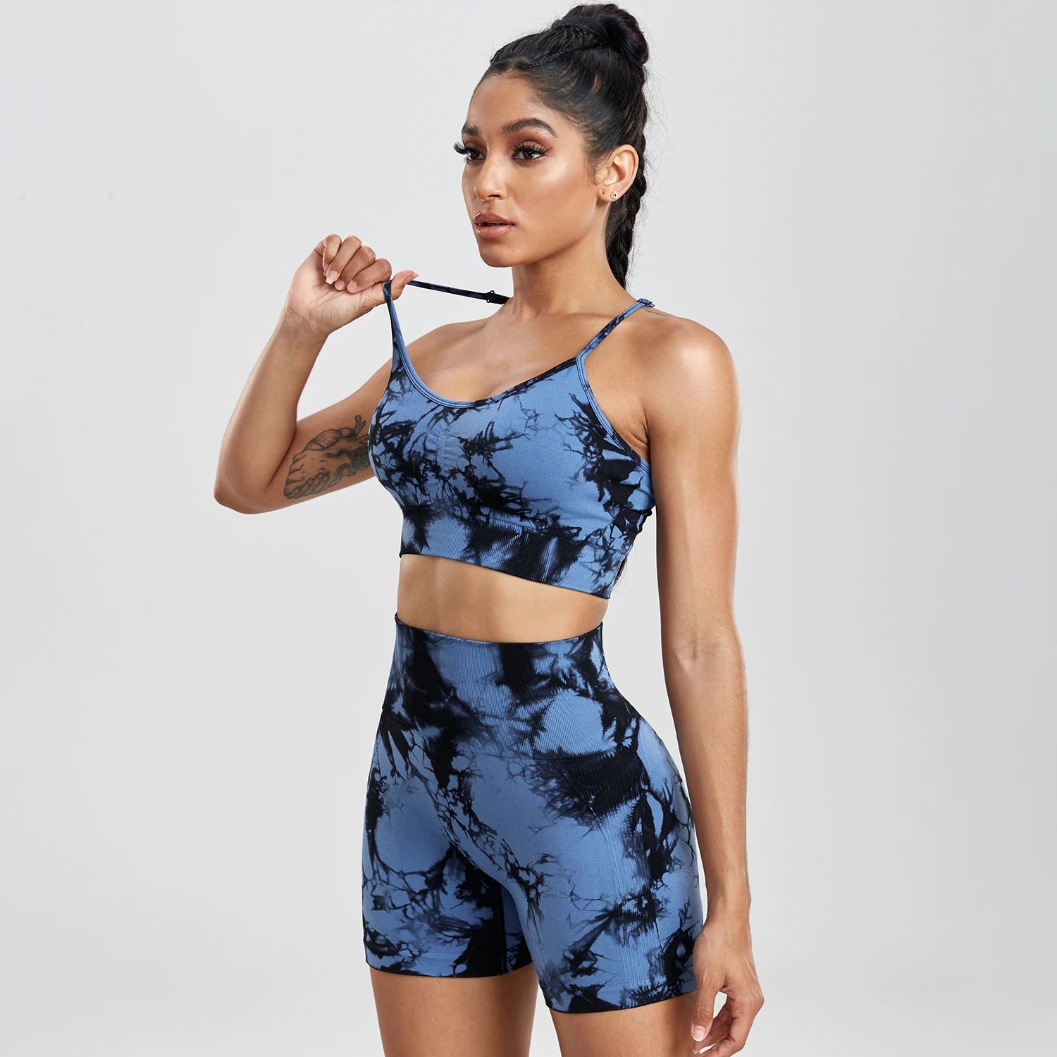 Tie Dye Summer Gym Fitness Shorts Sets Seamless Contrast Color Casual High Waist 2PCS