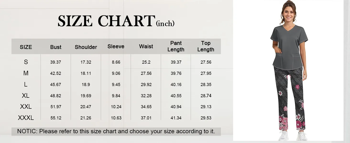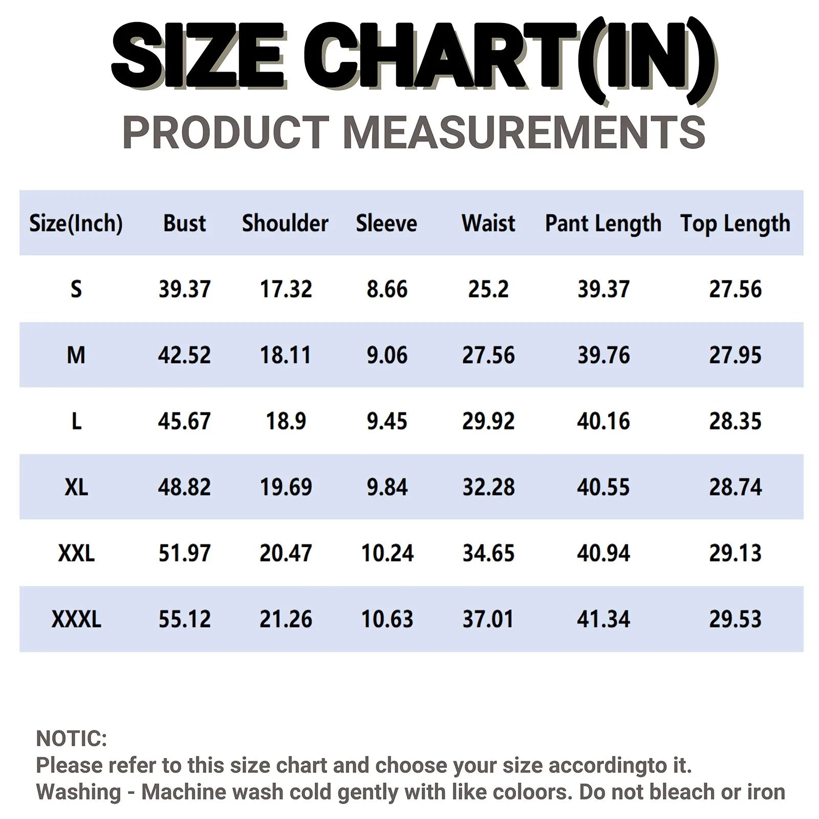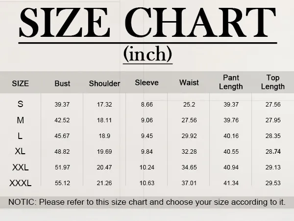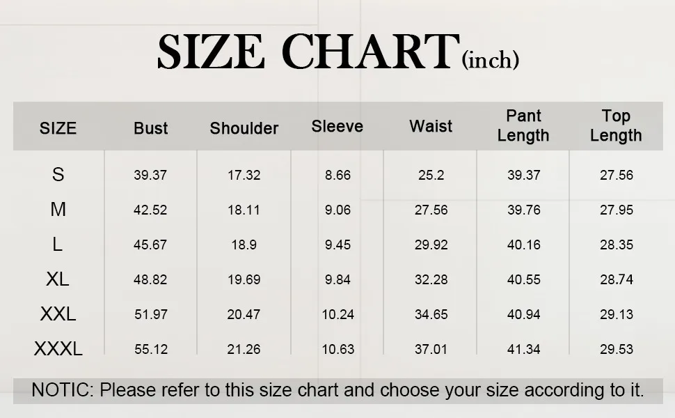 | Size | Bust | Shoulder | Sleeve | Waist | Pant Length | Top Length |