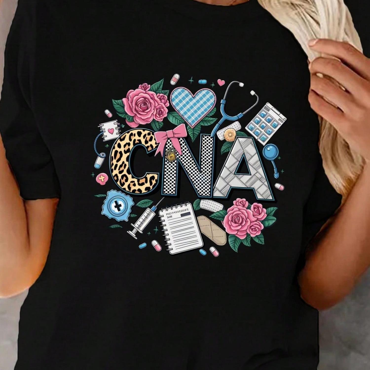 Women's CNA Medical Graphic T-Shirt - Casual Round Neck Short Sleeve Tee with Stethoscope, Rx, and Medical-Themed Print, Black, Everyday Apparel | Short Sleeve Shirt | Fabric