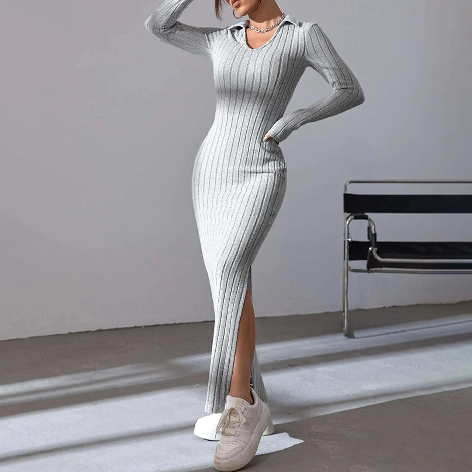 Women's Knit Midi Dress Long Sleeve Lapel Collar Solid Color Bodycon Long Dress Going Out Dress