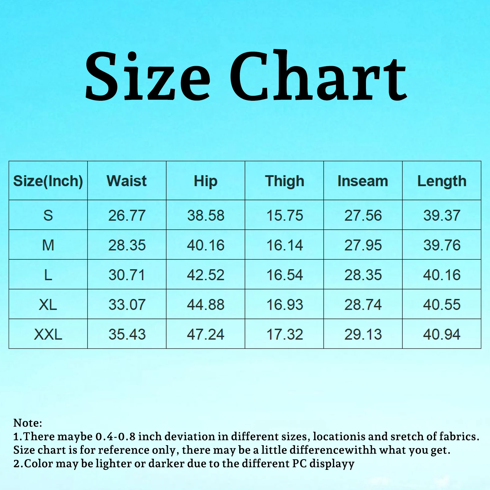 | Size | Waist | Hip | Thigh | Inseam | Length |